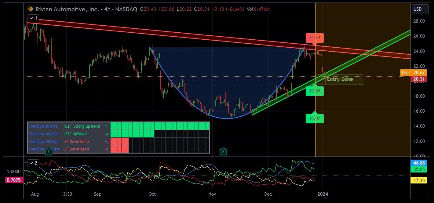 Once RIVN settles around there, bulls can charge in. Eyes on that $24 resistance line, our first sip of profit. Breaching that? We're talking a full-blown tea party, potentially reaching $34 – the double whammy reward for recognizing this cup and playing it right.