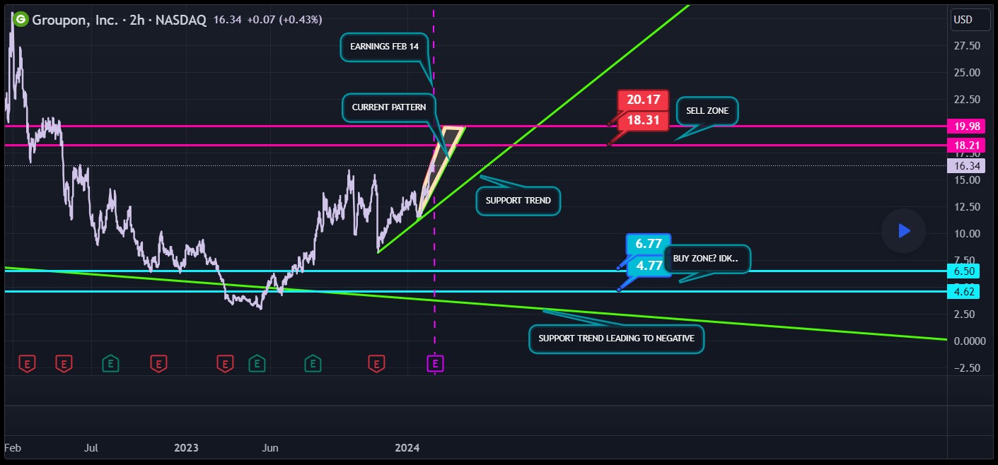 GRPN, the coupon app that defied expectations with its recent climb, seems to be perched on a precarious edge. The chart screams two opposing narratives: The Optimist's View: "Keep on climbing! $40 within reach!" With surging price action, some investors may still bet on continued momentum. The Realist's Warning: "Potential peak detected!" Technical indicators signal the party might be ending soon. A reversal and swift retreat, possibly back to $4 or lower, can't be ruled out. Let's be honest, this chart looks like a rollercoaster without a seatbelt – exhilarating if you like thrills, nerve-wracking if you don't. As investors, we often face a risk-reward dilemma. While further gains are possible, missing the boat might actually be easier on the heart than weathering a sharp potential pullback. Takeaway: While I personally lean towards a bearish outlook on GRPN, it doesn't necessarily mean it's doomed. But tread carefully - chart readers might sense a top forming within the pink zone, signaling a shift from bullish to bearish territory. This one's for investors who enjoy a dash of calculated risk with their morning coffee! |